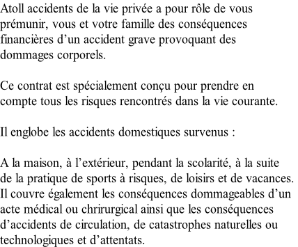 Une protection au quotidien pour vous et les membres de votre famille DES GARANTIES INNOVANTES ET UNIQUES Pour plus d’information Jusqu’à 1 million d’€uros d’indemnité  maximum par personne GARANTIE DES ACCIDENTS DE LA VIE Nous contacter RETOUR  PAGE SUIVANTE